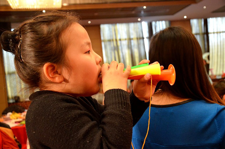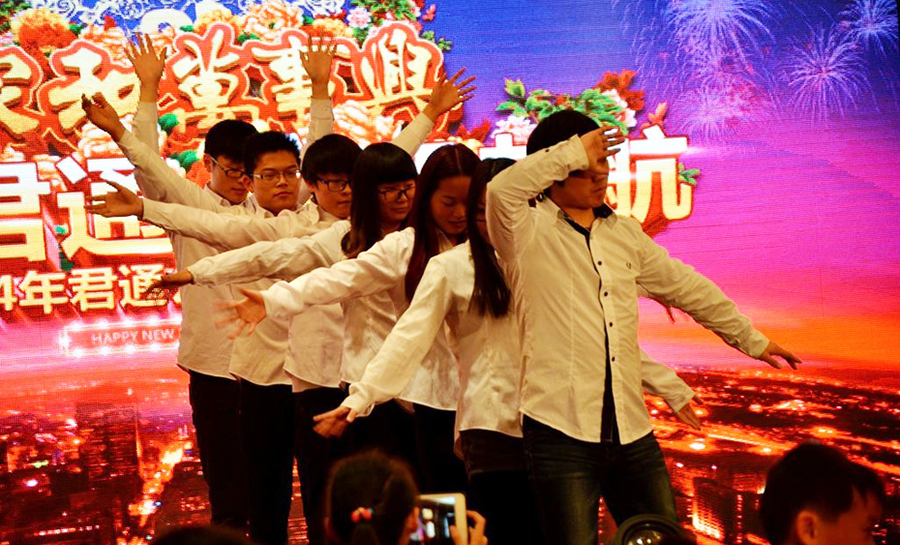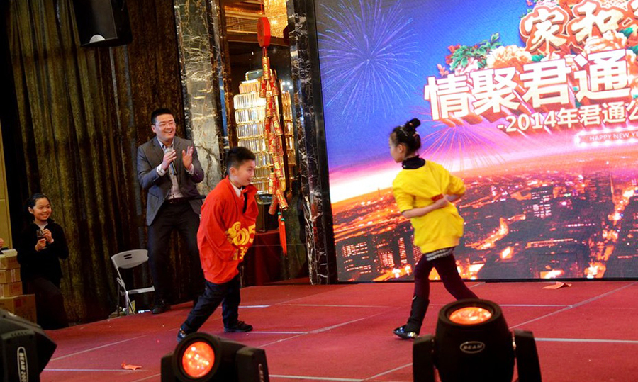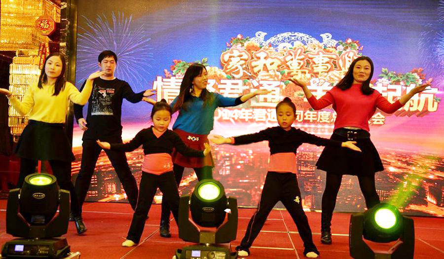 君通的春晚现场仿佛是一个欢乐的大家庭,演出以部门家庭为单位,更有许多员工可爱的孩子也表演了许多节目。 市场部的美女妈妈带着双胞胎女儿跳起了欢快的《小苹果》