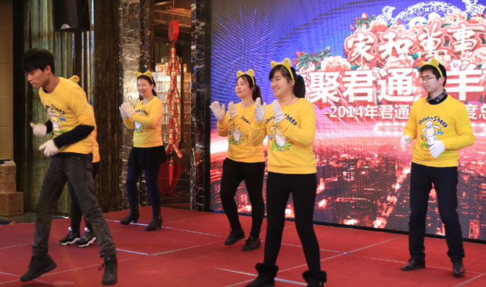 下午以一个片段开始了君通晚会,视频中都是过去一年君通人,难忘的场景和相亲相爱的照片,让我们每个人感受到在君通这个大家庭特别的温馨和温暖,视频结束后个节目是行政部表演《相亲相爱一家人》手语,那情景,更让大家感受到家和万事兴,在君通会拥有家的感觉,会拥有呵护成长直到翱翔天空的感觉.......