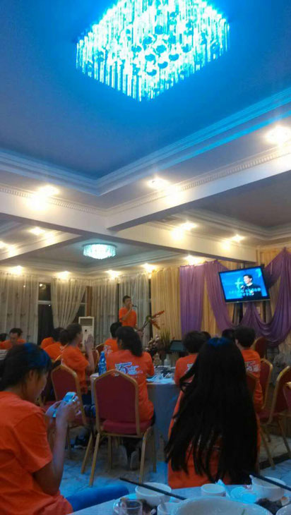 时间过得很快,一眨眼到了晚宴时间,一大家子在一个大厅吃饭,其乐融融。台上我们公司大佬王经理带头唱起了歌给大家助兴,大家也纷纷送上了祝福,我们的大家长尹总也唱起歌送给我们君通给在场的所有人。