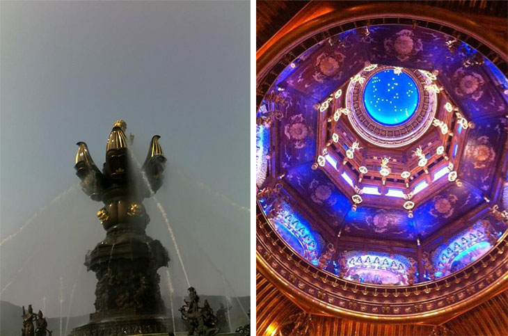 在九龙灌浴广场,我们可以看到一座含苞待放的巨大莲花铜雕矗立在前方,巨大的荷花由四个威武的大力士托起,底部衬托着白色的圆形大理石水池,九条飞龙和八个形态各异的供养人环绕着巨大的水池。当《佛之诞》音乐奏响时,巨大的六片莲花瓣徐徐绽开,一尊高达7.2米全身鎏金的金身太子佛像,一手指天,一手指地,从莲花中缓缓升起,同时,九龙口中一齐喷射出数十米高的水柱,为太子佛像沐浴。顷刻间,广场四方鼓乐齐鸣,喷泉百态千姿。看完了这一壮观胜景,洗清了脑海中的茫然,参透了目标的重要性,在静谧中感受了佛法无边,浮躁的心灵也接受到了洗礼,曾经迷茫的前方也渐渐清晰。