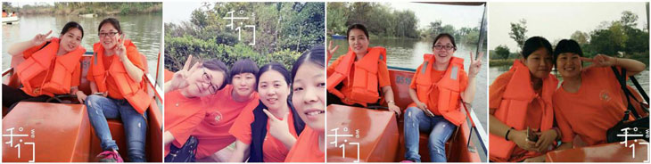 午饭后去划船啦!!!清澈的湖水,让人心旷神怡,突然后面有搜船在追赶着我们,是电销的男童鞋,开始了水上划船大赛,经过两圈的角逐,还是我们赢了,可以停下来欣赏下这美丽的景色,再美美的拍个照片,看我们客服部的菇凉们多开心: