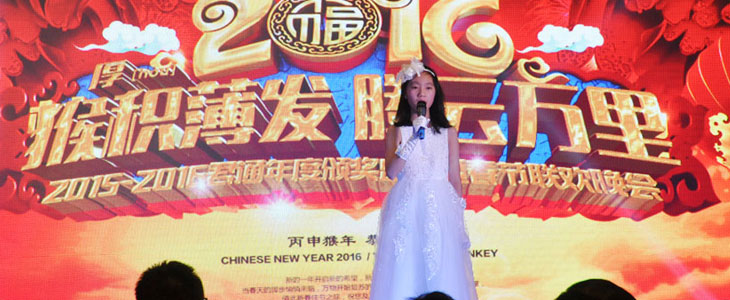 下面首先有请我们君通的大家长尹总来给2016年度君通杯春晚致开幕词,本届君通杯春晚尹总邀请了她的姐姐姐夫、她的老同学老领导等嘉宾莅临本次春晚,尹总作为东道主首先隆重地介绍了他们的到来:
