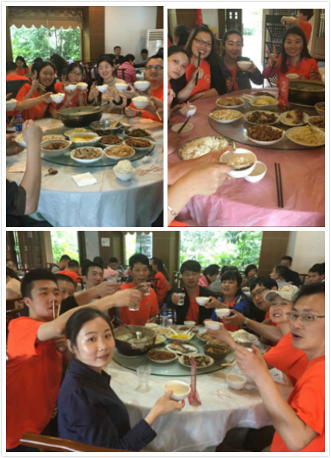 对,你没看错,除了以康总、蒋超、谈师傅、彭郁等为首的男人帮参加了滑索,我们也有杨红、张雯、丁玉、沈秋萍、花丹丹等几位女中豪杰也参加了本次高空滑索。。。。。。再次为他们勇于挑战的勇气点赞加分,在大家纷纷赞叹他们、给他们欢呼庆祝他们挑战成功时,汪导要带我们去吃大餐了: