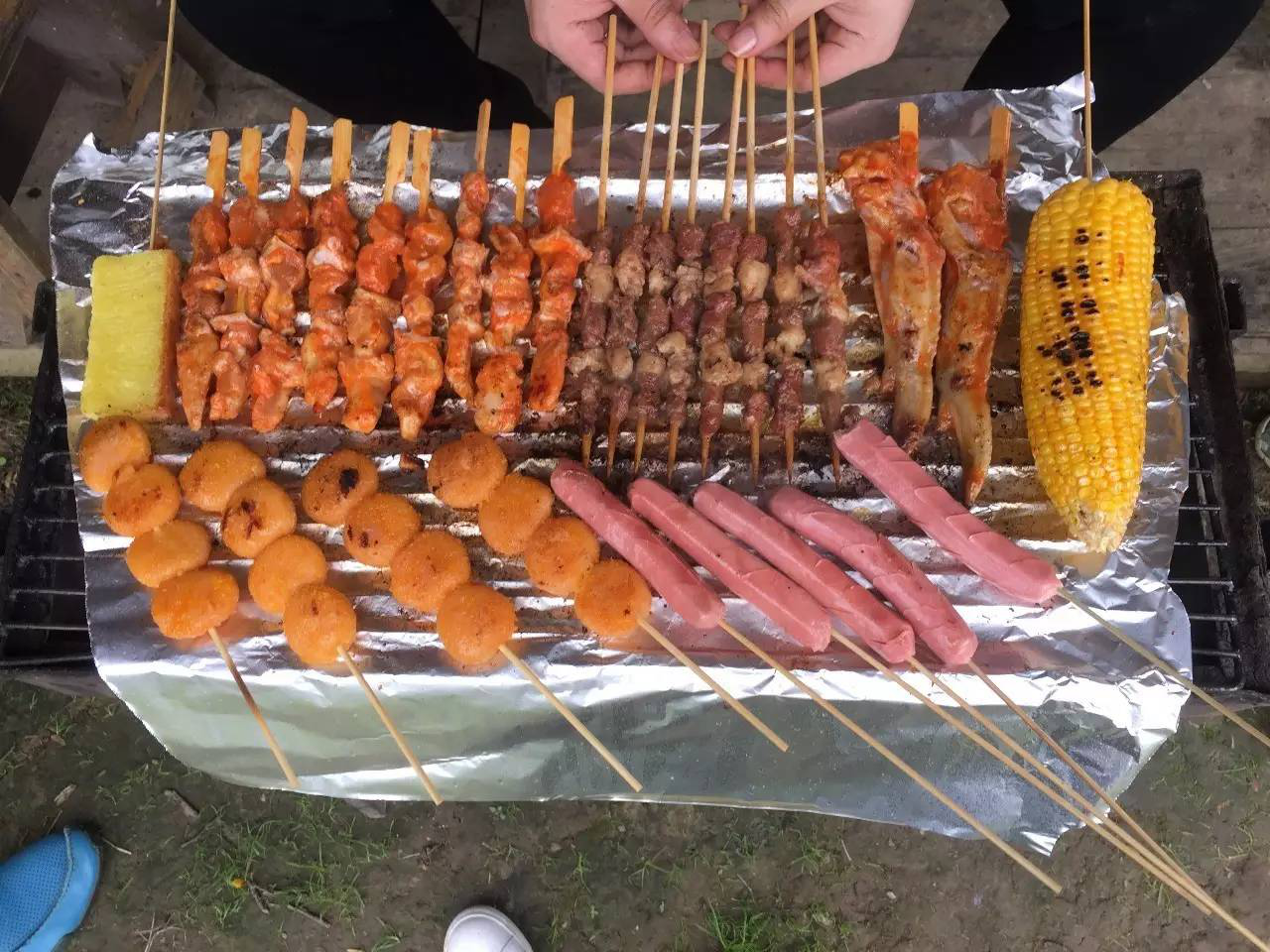 哇!烧烤摊摆起来了,新出炉的玉米,羊肉串,快来买呀!那个家伙是老叶吗?烤肉做的好香呀!刚才烤好,已经被瓜分了,以后退休了,你可以开个烧烤摊!到时我一定光顾!