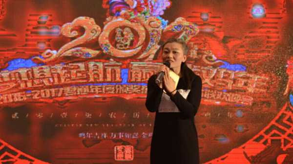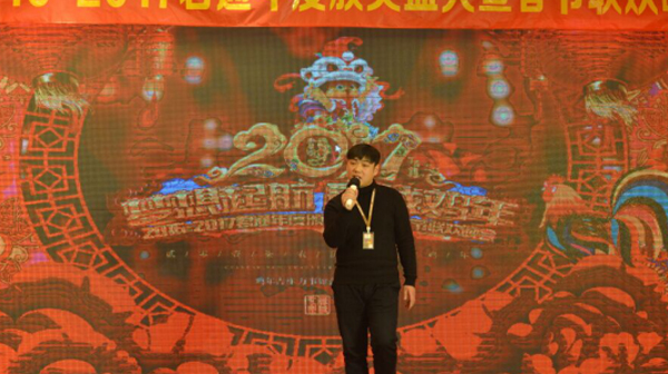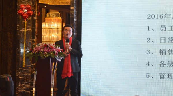 2017年1月16日上午9时许,主持人杜总宣布年终总结大会正式开始了。首先上台给大家做工作报告的是我们敬爱的大家长尹总。