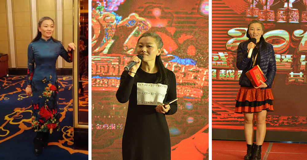压轴戏,我们的旗袍秀,秀出了君通娘子军的风范。看仙仙的俭妹妹,秀气的小任,活泼的小朋友,大气的张经理,君通的姿深美女代表王姐,一件旗袍,展现了她们的妖娆,和秀美。哇!我们的女王出场了,章会计挽着尹总的手,缓缓的向台前走来,挥手间,君通当家人博爱和大气展现尽致!大家掌声欢呼声久久!看着尹总慈爱的挥手,好想送一束漂亮的花给你!