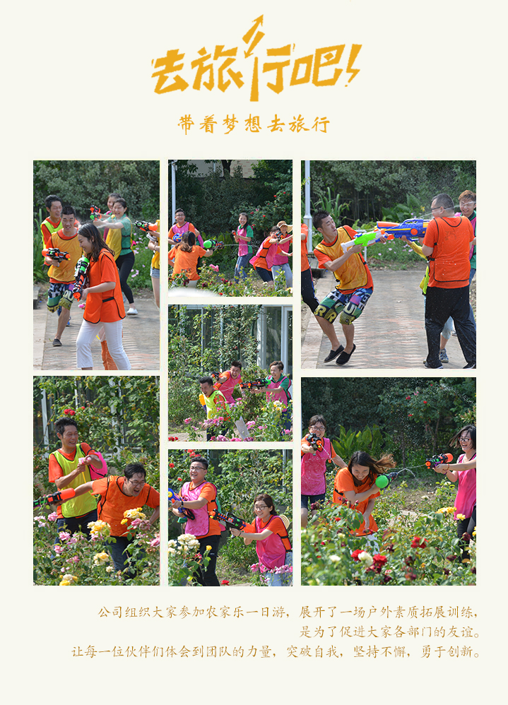 2017年6月4日,春风绵绵的日子,公司组织大家参加农家乐一日游,展开了一场户外素质拓展训练,是为了促进大家各部门的友谊。让每一位伙伴们体会到团队的力量,突破自我,坚持不懈,勇于创新。