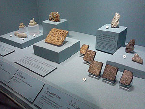 台北故宫博物院的第三层展出的是图书、字画、碑帖、玉器、雕刻和织绣。玉器展台上让人叫绝的是一棵清代的翡翠玉白菜。玉器匠人将一块半白半绿的翡翠为料,运用玉料自然色彩的分布,白色部分雕琢成菜帮,一丝一缕分明;绿色部分雕琢成白菜叶子,凹凸起伏、一收一放自然,活灵灵一棵新鲜的白菜,娇嫩欲滴,仿佛一捏会流出水来。更叫绝的是,白菜叶子上微黄的部分雕琢成两只蝈蝈,正在吃白菜,让你不敢大声喘气,生怕惊跑了它们。这棵翡翠玉白菜是清末瑾妃的陪嫁物品,放在永和宫内,白菜寓意清白,象征新娘纯洁;蝈蝈生殖力强,象征多子多福。