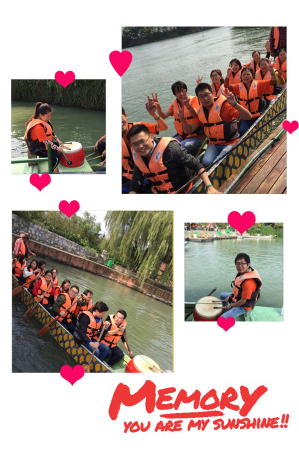 团餐过后迎来下午的活动,让我期待的赛龙舟终于来啦!由浦团分组指导,分别以康总,邓总,吴青,高鹲为鼓手的四支队伍诞生了,每组11人。说起赛龙舟,想着锣鼓震天,百舸争流的场景,所以我的心潮早已翻腾起来。只见水面上两排龙舟蓄势待发,高鹲吴青组齐上阵,康总邓总组压轴,赛手们精神抖擞,卯足了劲,在浦团的口哨声中开始了比赛。鼓手们边敲鼓边激励士气,赛手们奋力冲刺,争分托秒,岸上的伙伴们也在欣喜若狂地喝彩着。为赛手们的勇气与拼劲鼓掌加油。比赛先后已经不重要了,重要的是每一个拼搏着的君通人都是我心中的英雄。无论做什么事,拿出赛龙舟的姿态,不畏艰难,勇往直前,胜利是在岸边等着你!