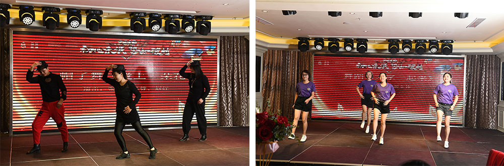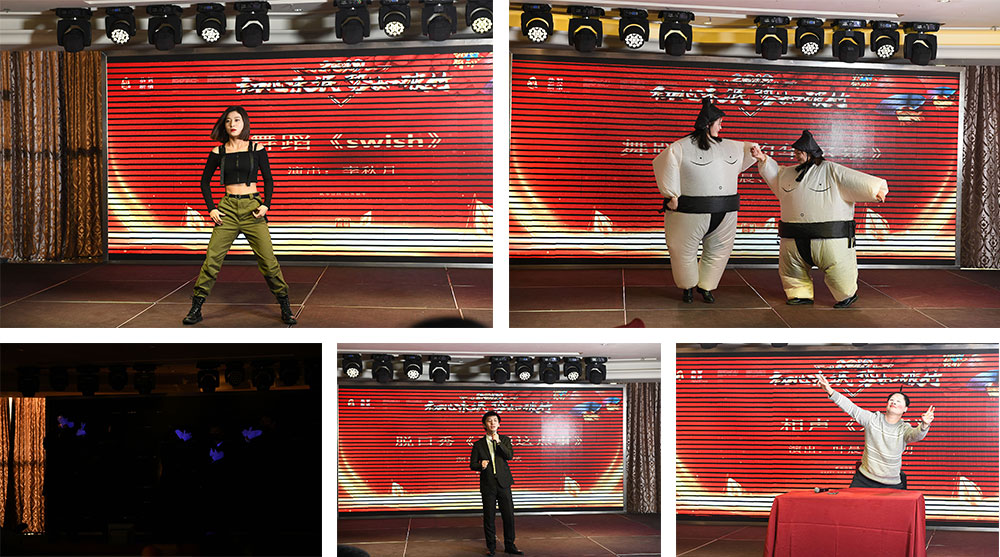 高产的电销部这次不仅派出了新生代美女代表李秋月献跳性感火辣的爵士舞《swish》,还别出心裁的表演了搞笑版的美女相扑舞蹈《爱的华尔兹》和手影舞《遇见》。果然姜还是老的辣,电销老将叶晨、柳智明倾力表演的双簧爆笑,观众们笑得前仰后合,而我们的新人王 沈陈斌带来的脱口秀 《君通这点事》和歌曲《挪威的森林》也让我们感受到他工作之外的魅力。