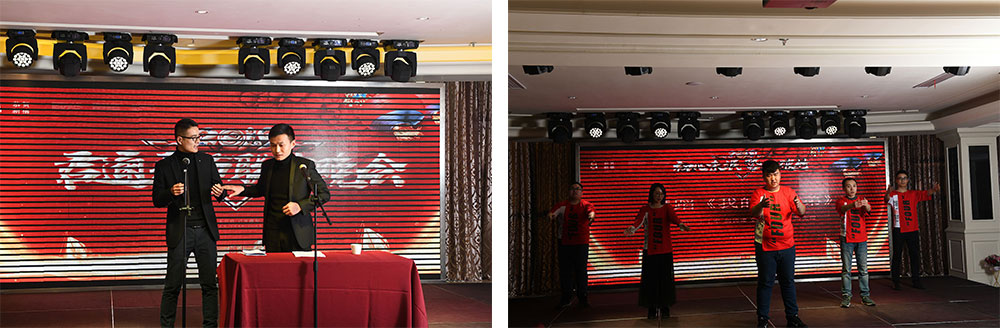 本次年会除了传统的歌舞小平表演外,还新增了不少特色节目表。梁山小分队的相声《好嗨哟》,而他们团队带来的另一个手语舞《我的好兄弟》歌声激情澎湃,手指舞真挚感人,当唱到“朋友的情谊呀比天还高比地还辽阔,那些岁月我们一定会记得;朋友的情谊呀我们今生的难得,像一杯酒 像一首老歌”时,跟唱,台上台下相呼应,真挚的情感透过歌声传达了“君通人就是相亲相爱的一家人”的理念。