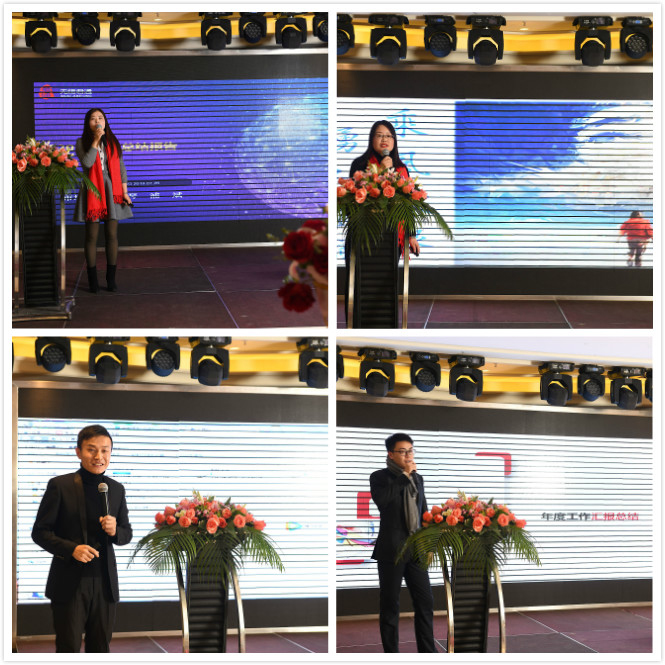 接下来就是我们的高管们做年终总结报告,首先是技术部的技术总监杜工,为整个部门的工作做了一个完整的数据分析以及2019年个人希望公司主要做好服务和品牌上,做到客户的满意是我们永恒的追求,同时还要继续保持君通在无锡市场的品牌影响力。接下来的是技术大咖顾工主要是围绕整个多媒体的大环境做了一个简短明了的报告,接下来是客服部经理刘苏对本部门的过去一年的工作做了总结和汇报,可以看出君通在思亿欧的年会上拿连拿两年的服务标杆中心不是白拿的,客服姑娘们的努力和敬业服务着我们的每一位客户,同时客服的姑娘们也在不断努力的提升自身的产品知识来更好的服务我们的客户,相信2019年有君通客服团队的坚强后盾,在一线拼搏的销售们大可撸起袖子加油干了,接下来是何淑琴代表人事部和行政部发言,对过去一年的人事招聘和行政管理工作的总结,对2019年人事招聘工作的规划,为君通注入新鲜血液是2019年人事和行政的重要的工作,还有就是市场部的大区经理赵经理和张经理分别对自己部门的员工和自己过去一年的业绩做了总结,同时也对2019年的业绩做了规划,相信在你们的努力下2019年业绩翻番不是问题,还有就是电销部的团队带领人叶晨和梁山小分队的带队人齐晓阳分别对自己部门去年一年的业绩做了分析和数据的解析,通过他们这些数据的分析,得出想要开单必须努力打电话积累意向客户,有了沉淀才有不断爆发的开单,2019年电销部有你们带队,开单不是问题,加油吧小伙伴们,在我们的掌舵人尹总的简短总结下,上午的年度报告总结大会结束了,让所有台下听报告的人都对2019年充满了期待。