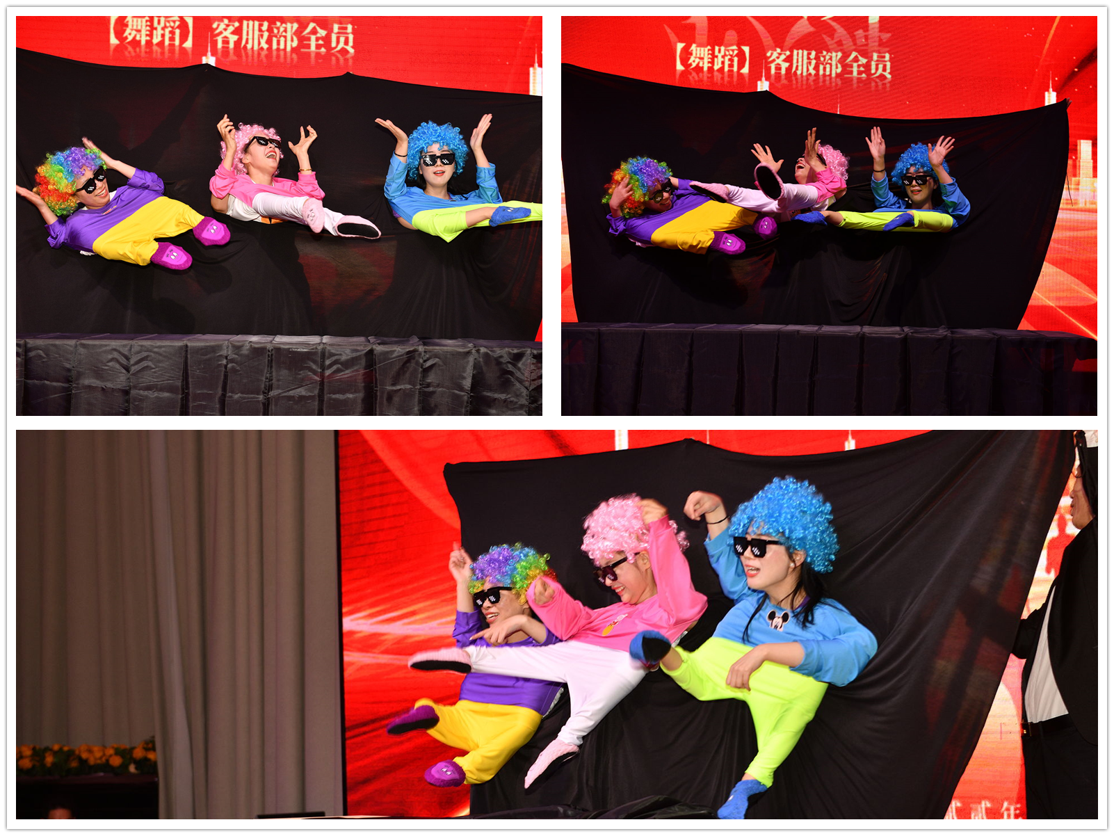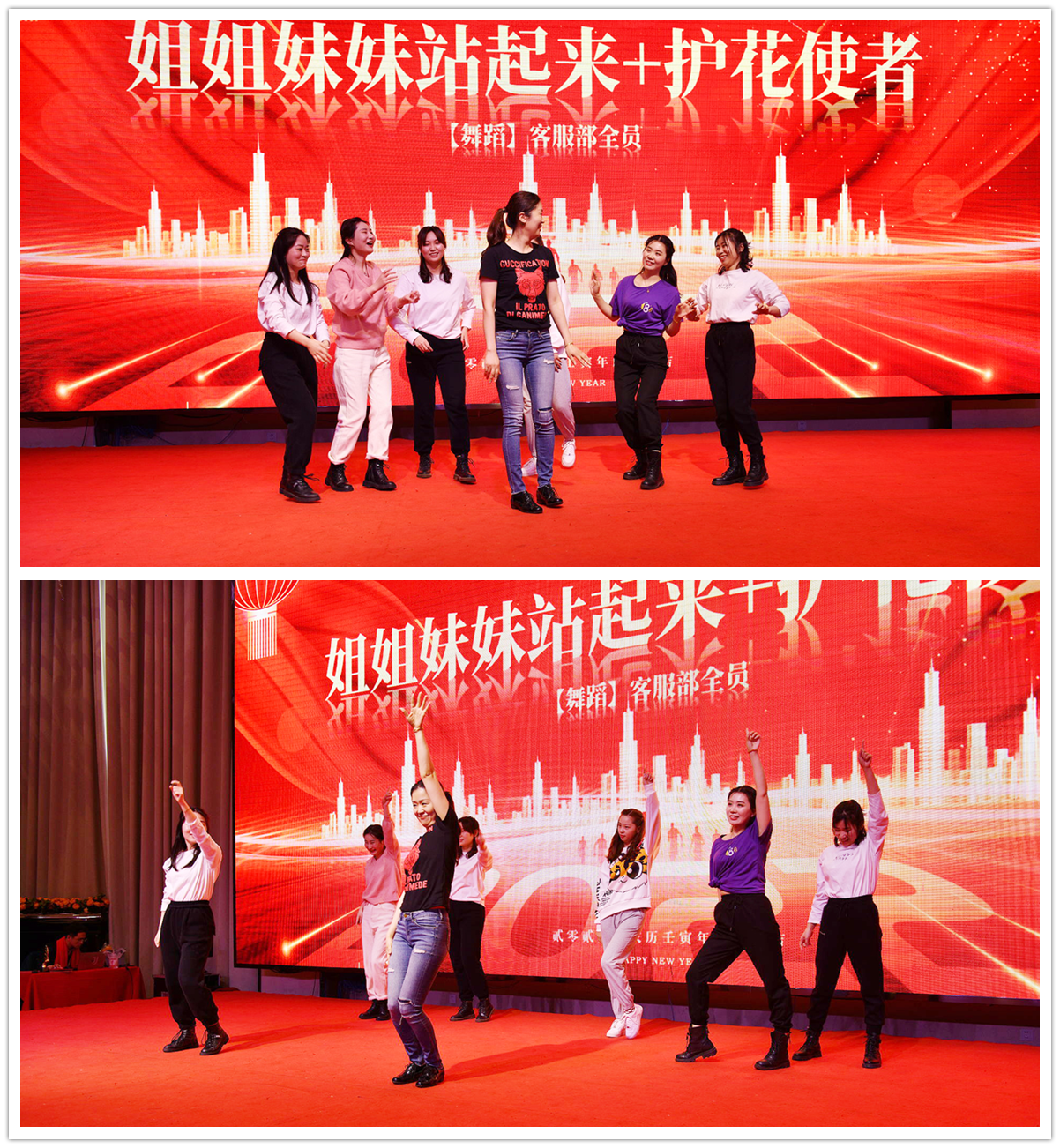 每次晚会大家也比较期待的就是我们客服菇凉们的登场了,颜值担当的客服部全员在方方的带领下热情得跳起了舞蹈《姐姐妹妹站起来+护花使者》,把晚会的气氛一下子带动了起来: