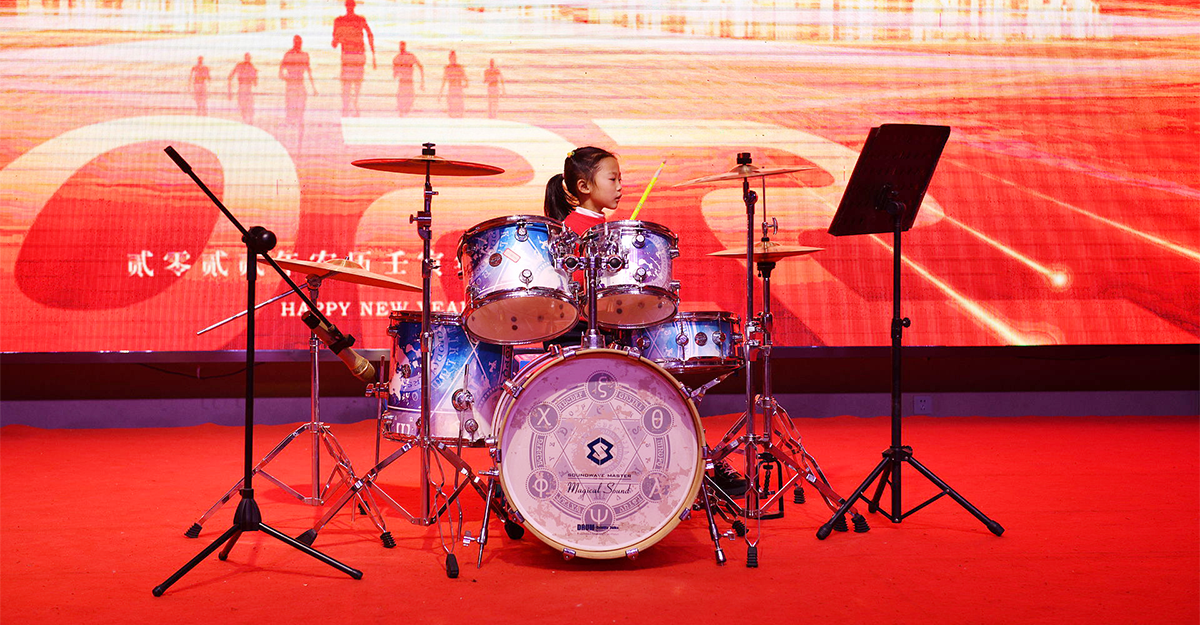 接下来是个大家伙,把一整套架子鼓搬来现场也是不容易,技术部顾健美的女儿子恒为我们带来超级震撼的架子鼓表演《踏山河+像风一样自由》: