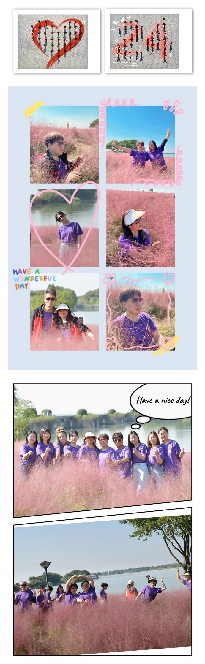 此次的目的地是——贡湖湾,自行驾驶前往,所以大家都很迫不及待的早早赶去目的地,到达目的地大家被眼前的粉色乱子草吸引,开始拍各种美照,虽然开心但是还不能忘记我们的任务哈,毕竟今年23周岁了,我们的数字航拍还是要继续的哦,这次不仅数字的航拍还外加了爱心的航拍,在控场人员的组织和安排下,大家有序的按照之前准备好的位置,各自找准位置站好,随着321倒计时,兴奋开心的挥动着小红旗,场面壮观而好看,君通人,在一起,手牵手,共创未来,迎接美好的篇章。